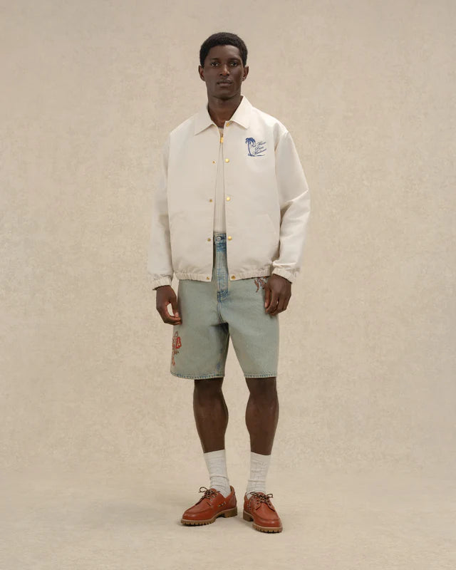 Upptäck avslappnad lyx med Veste Slogan Palmier från Drôle De Monsieur, en lätt jacka i en sofistikerad off white nyans. Den minimalistiska designen lyfts av det ikoniska Slogan Palmier-trycket på bröst och rygg, vilket skapar ett uttryck som är både modernt och självsäkert. De graverade tryckknapparna och de diskreta welt-fickorna förstärker den stilrena helheten.