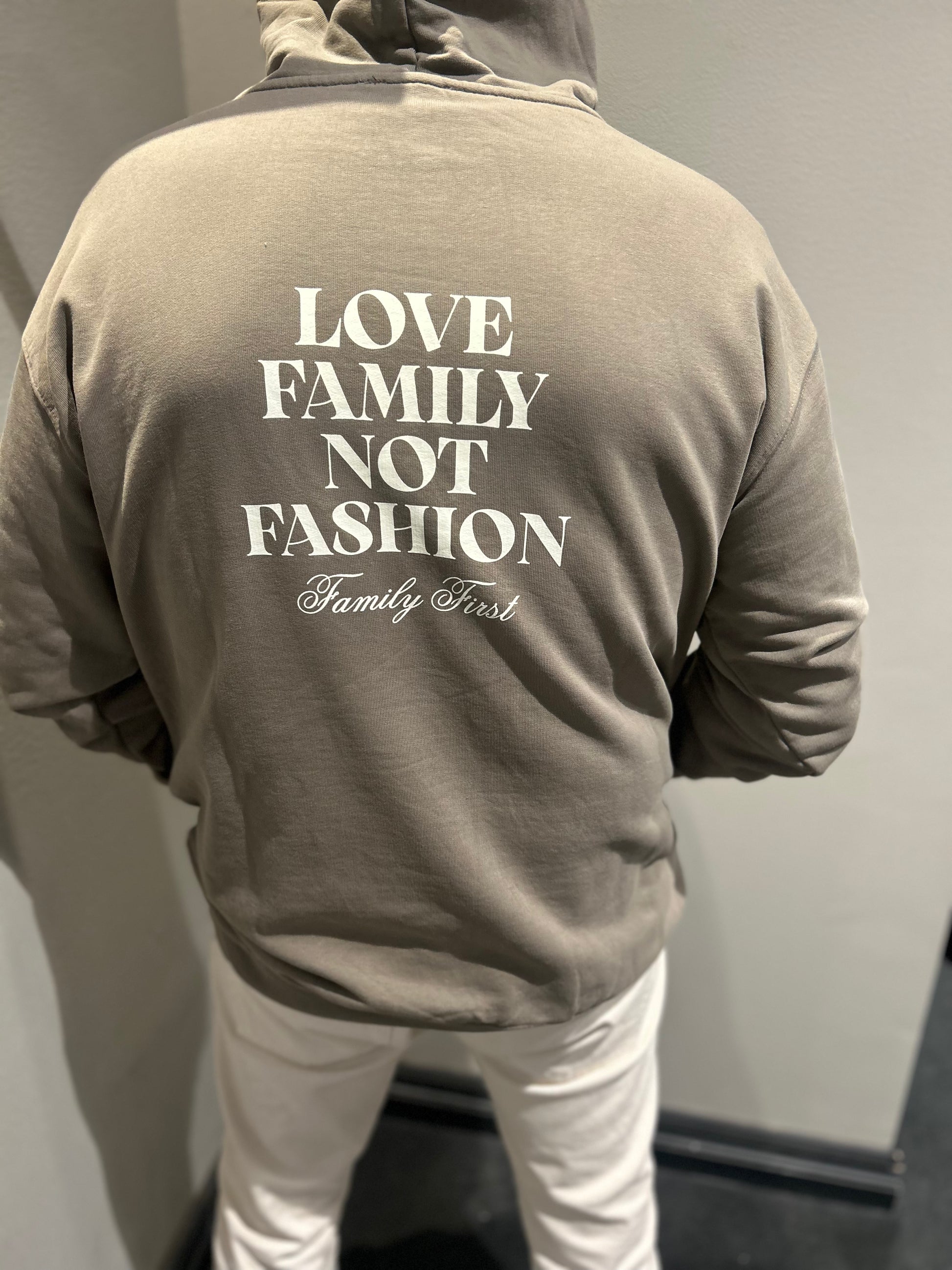Tillverkad i premium-bomull med perfekt passform, kombinerar hoodien komfort med en modern streetwear-känsla. Detaljen som sätter pricken över i: punchlinen “Love Family Not Fashion” – en stark påminnelse om varumärkets själ och unika identitet.