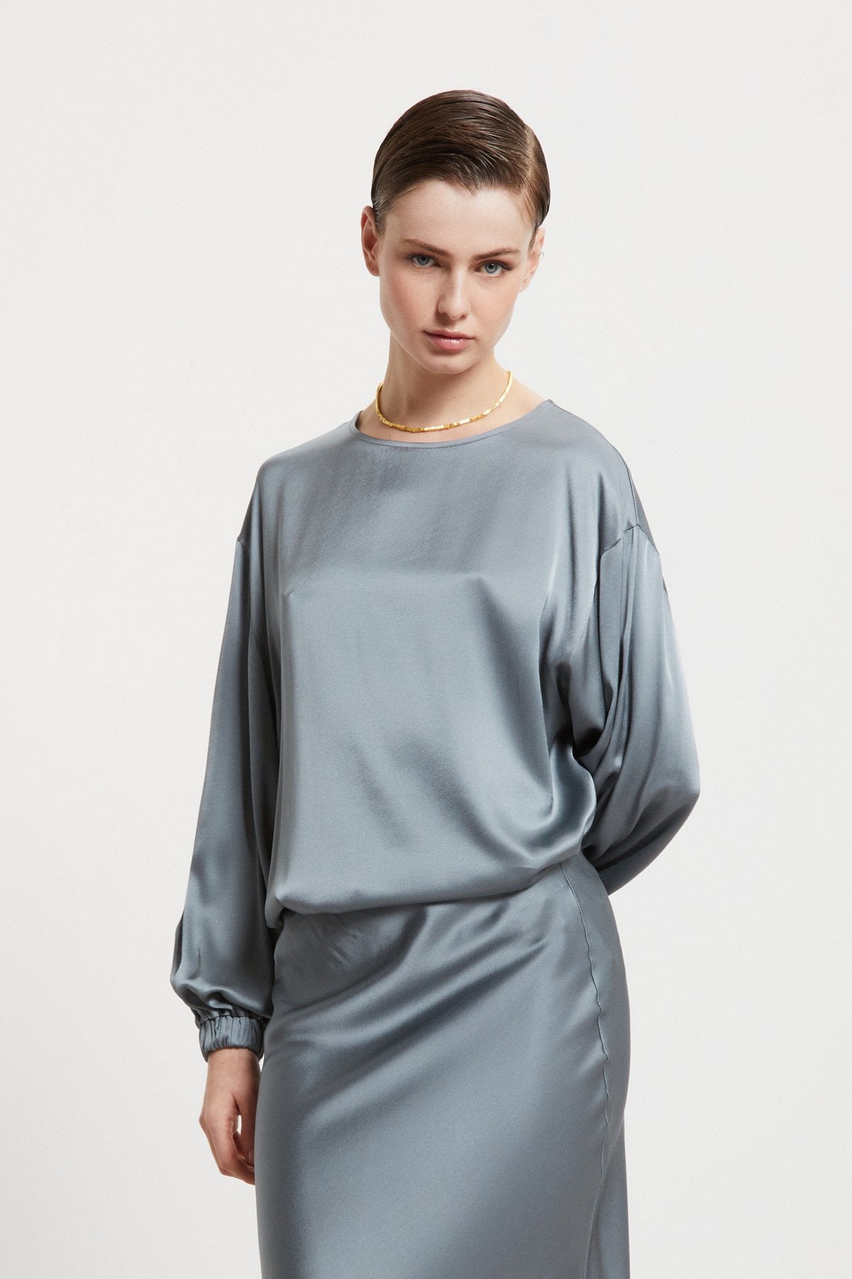 Upptäck Otto dáme’s Viscose Blouse – en sofistikerad fluid blus i ren viskosatin som förkroppsligar tidlös elegans och lyxig enkelhet. Med sina dramatiska ballongärmar och den subtila båtringningen är plagget en perfekt kombination av modern design och klassiskt uttryck.