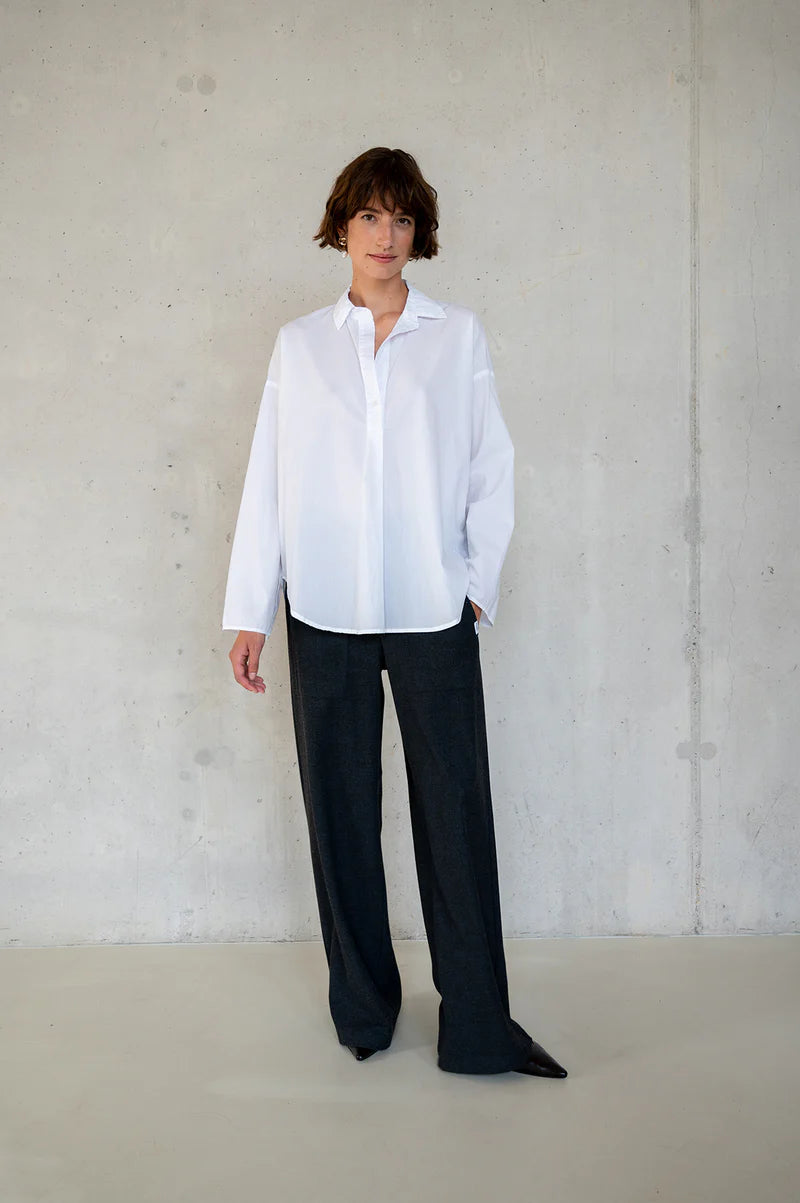 5Z822 från Penn&Ink är en tidlös blus i 100% bomull med en luftig boxy fit som kombinerar modern enkelhet med avslappnad elegans. Den halva knäppningen framtill ger ett sofistikerat uttryck och gör plagget mångsidigt – lika fint instoppad i byxor som buren löst för en mer ledig look.