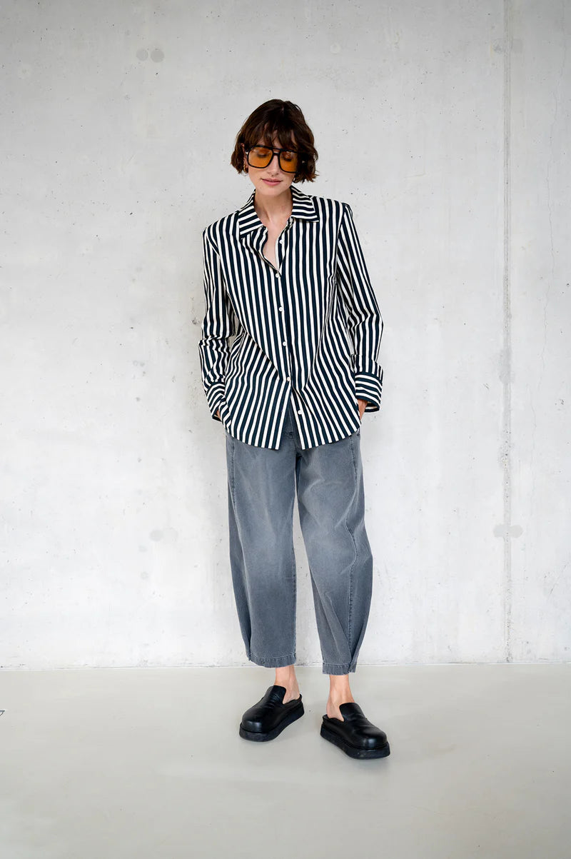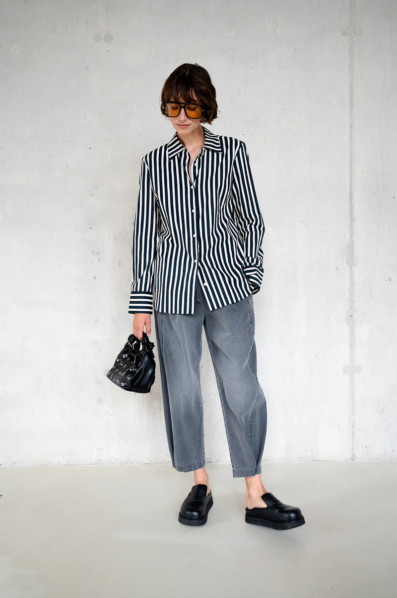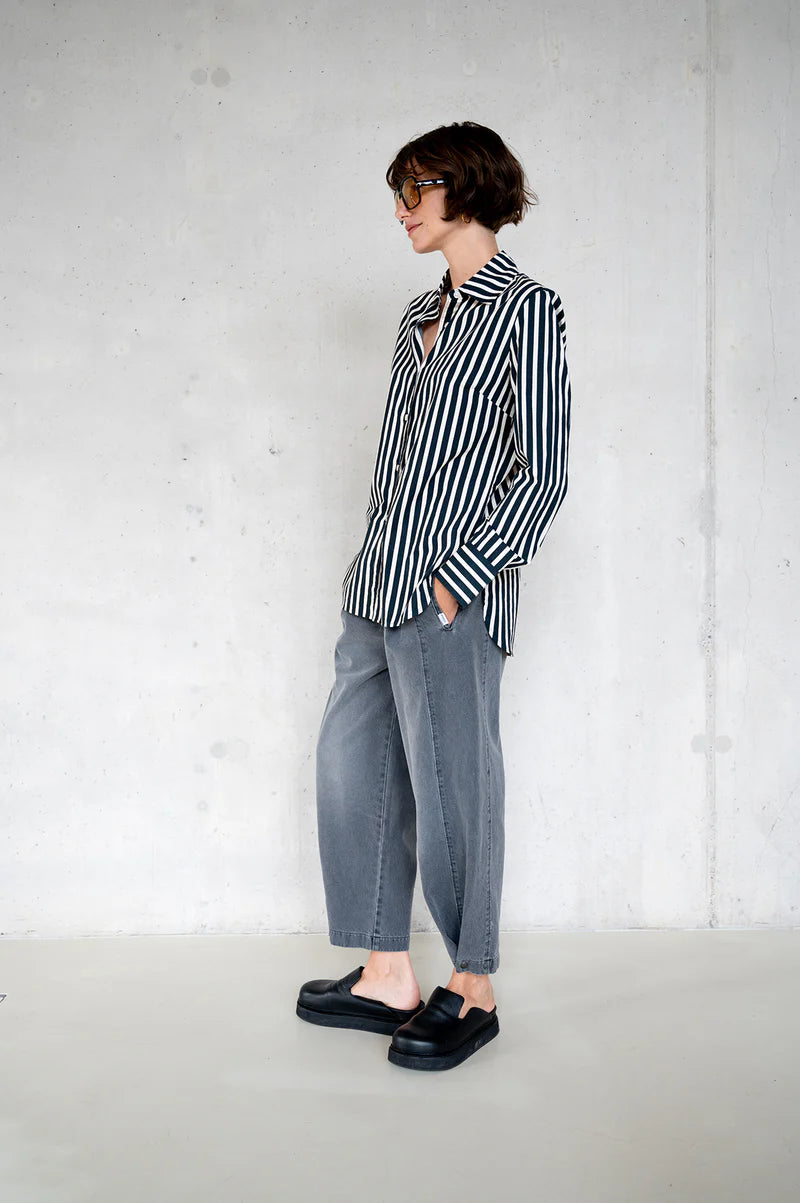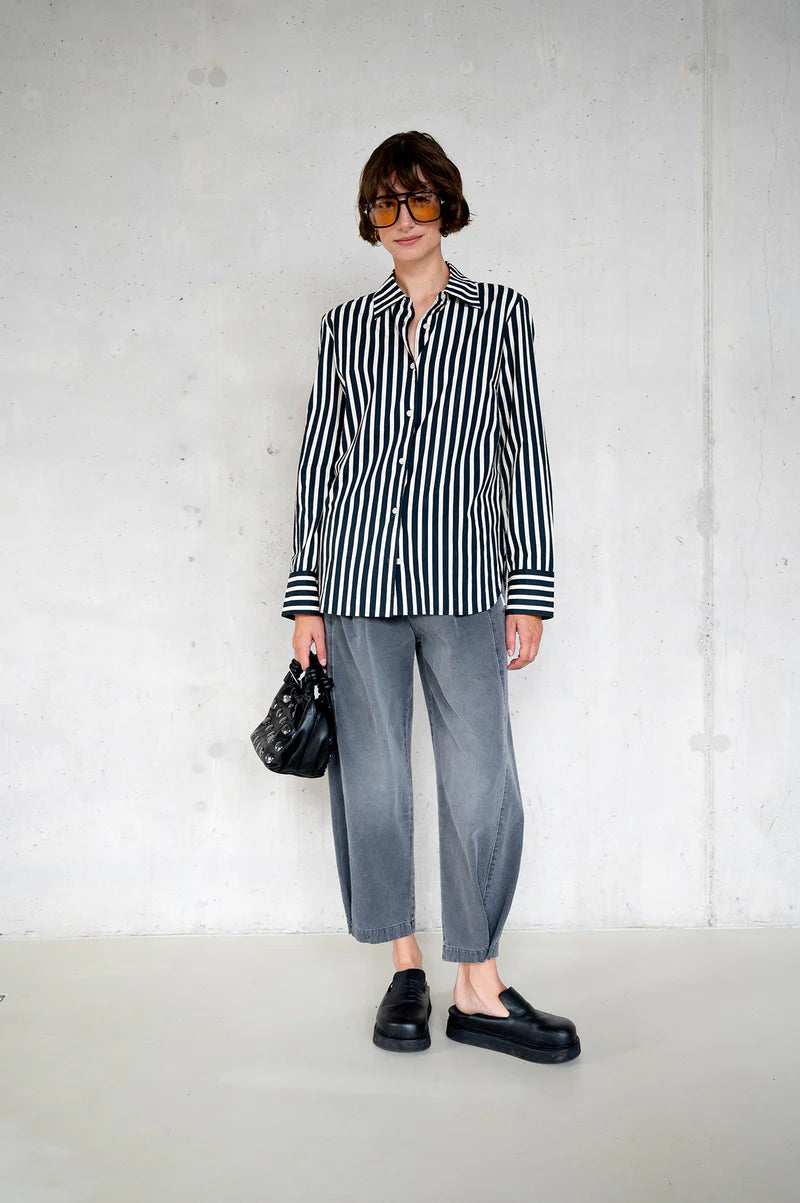 E035LTD från Penn&Ink är en klassisk randig blus i svart och ecru, skapad för att förena tidlös stil med modern enkelhet. Med sin raka passform, klassiska krage och knäppning framtill är den lika självklar till kontoret som till en avslappnad helglook.