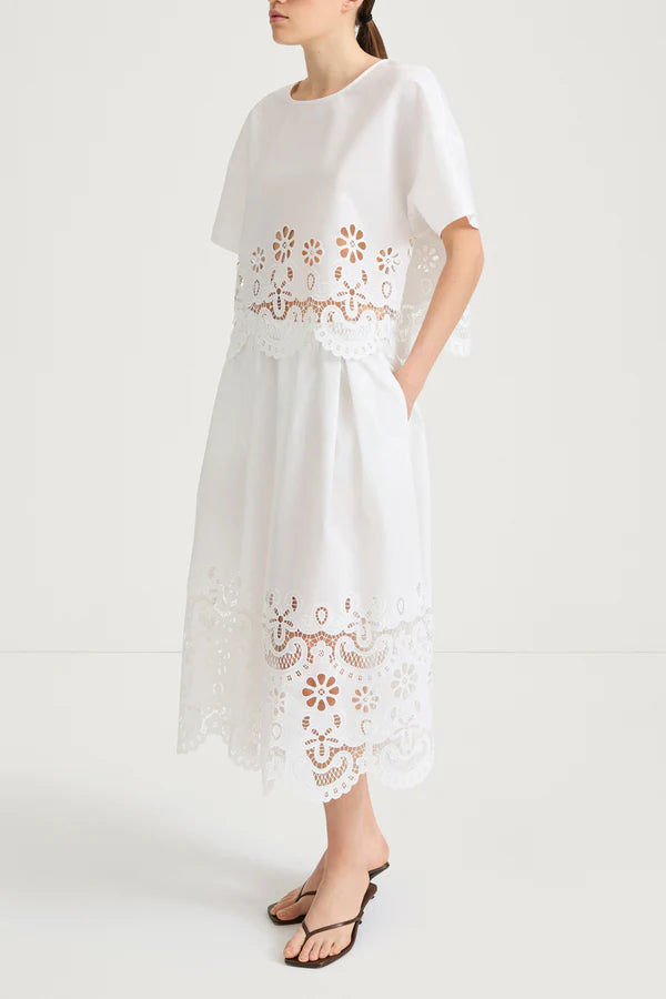 Jassira Blouse från Stylein är en modern och avslappnat elegant blus i mjuk bomull, designad med en boxig, croppad silhuett som ger ett samtida och stilrent uttryck. Den rundade halsringningen och de korta, vida ärmarna skapar en balanserad form, medan den dekorativa, scallop-broderade nederkanten adderar en feminin och sofistikerad detalj.